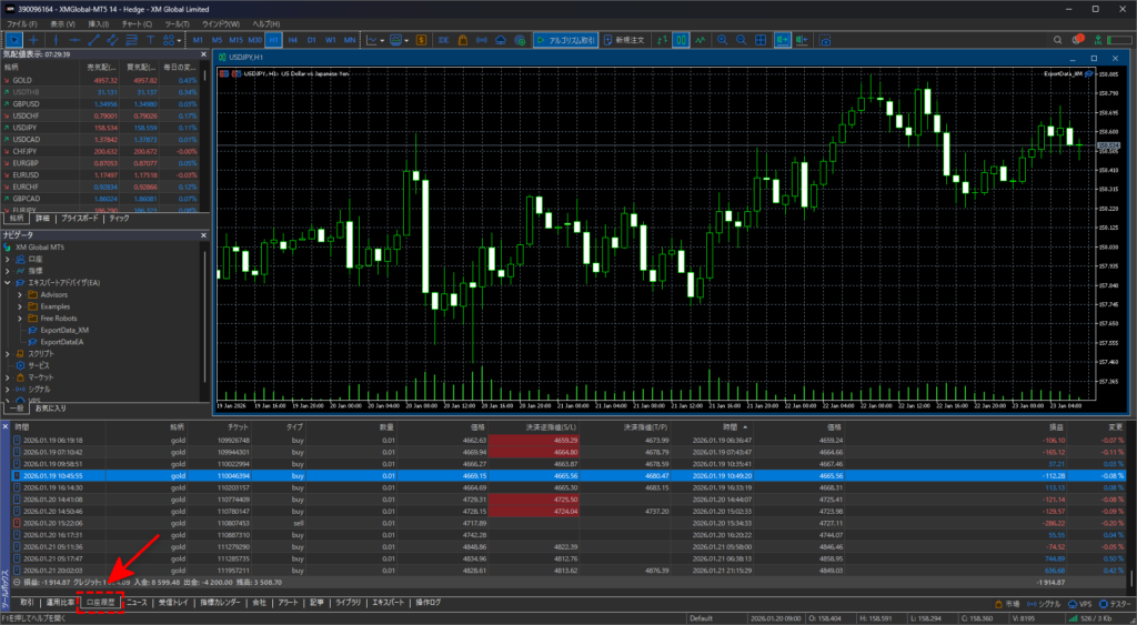 MT4、もしくはMT5を開き、ターミナルウィンドウから履歴タブを選択します。