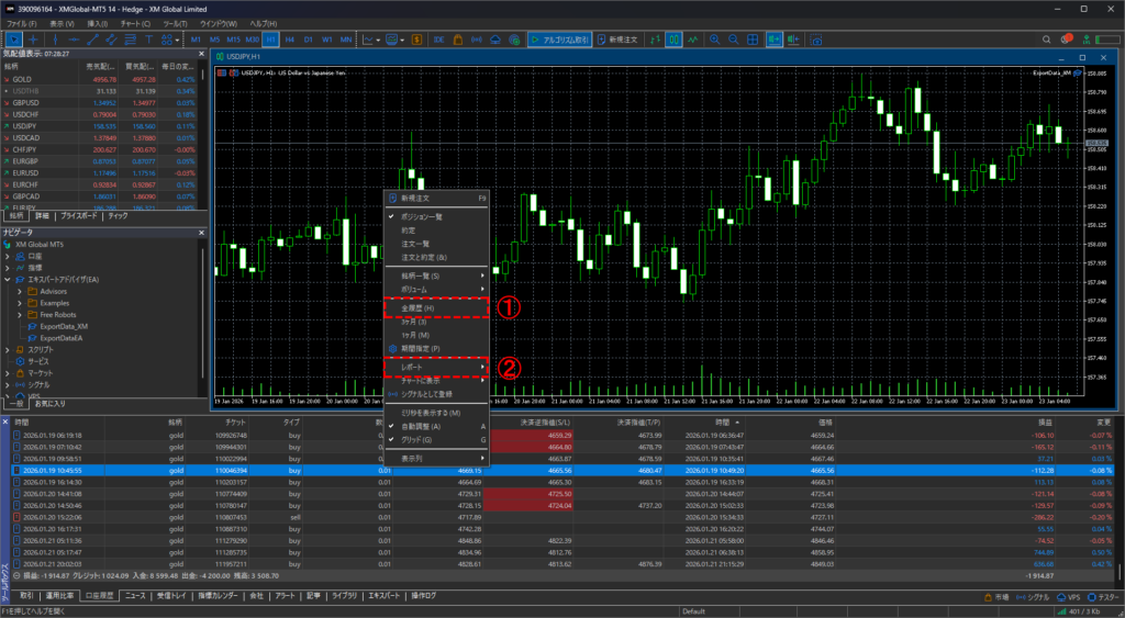 ターミナルウィンドウに履歴情報が表示されたら、表示された履歴上で右クリックし、メニューを開き、「全履歴」→「レポート」と進み、取引履歴情報を保存してください。
